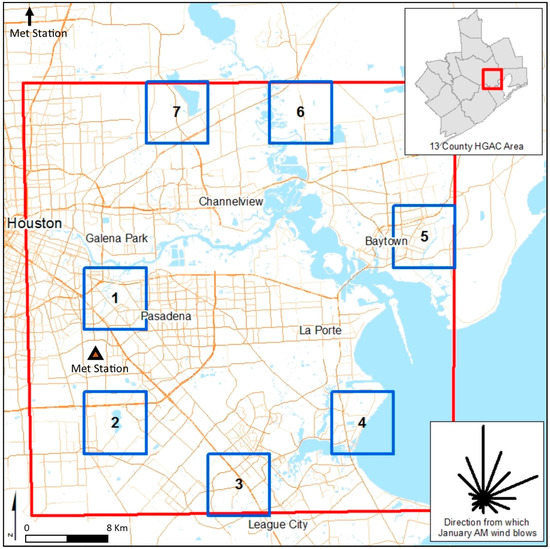We selected seven areas from a 7 × 7 grid (49 squares), dividing a 1746 km2 area around the Houston Ship Channel (Figure 1); each sample area was approximately 36 km2. On-road vehicle emissions of volatile organic compounds (VOCs), total gaseous hydrocarbons (HC), and particulate matter (PM10 and PM2.5) were estimated for each roadway segment within one kilometer of each of the seven selected areas using US EPA’s Motor Vehicle Emission Simulator (MOVES) (2014a). MOVES is the required model for the regulatory modeling of mobile source pollutants. Traffic volume data were obtained from the Federal Highway Administration’s 2012 Highway Performance Monitoring System network [22]. Peak hour flow characteristics for the Houston area were used to generate morning peak hour traffic volumes; likewise, fleet characteristics were based on Houston data available through the Texas Department of Transportation (TxDOT). We also used MOVES default vehicle fleet age distribution and the Texas Commission on Environmental Quality’s (TCEQ) Meteorological Data for Refined Screening with AERMOD from two different meteorological stations in Harris County, Texas for temperature and humidity inputs [23].