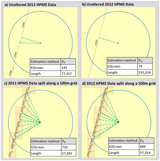 We hypothesized that a length-based correction would reduce the influence of this data artifact and better correspond to estimated PM2.5 concentrations. Thus, we derived index estimates similarly to the Block Level analysis, except that , where is the HPMS annual daily traffic volume and is the road segment length. However, this approach risks erroneously including portions of long segments that extend well beyond 500 m from a block centroid. For example, in Figure 3b, the included road segment has a length of over 2100 m, extending well beyond 500 m from the block centroid. To reduce the potential for erroneous inclusion of distant portions of roads, we first modified the HPMS network by dividing it along a 100 m square grid. This shortens the HPMS segments (with a new min/average/max of 0.002/73/194 m for 198,566 segments). These shorter road segments also provide a more granular estimate of the distance between each portion of the road and the block centroid. This modified network is used to derive . Comparing Figure 3c,d shows that differences in the road data’s segmentation (as shown in the 2011 to 2012 HPMS data) result in less than 0.2% change in the Length estimates when using this modified network.