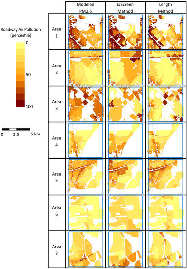 Figure 5 maps the modeled PM2.5 concentration and the EJScreen and Length roadway air pollution indices for each of the seven sample areas. Metric values are shown as a percentile to facilitate visual comparisons. Percentiles are estimated relative to values in all sample areas combined, so that identical concentrations have the same percentile in different sample areas. As might be expected given the results that are shown in Table 2, the Length correction appears to better approximate modeled PM2.5 roadway concentrations in most areas. In contrast, the roadway index for EJScreen tends to show greater concentrations in locations that are further from roadways; this is largely due to the coarse grain of a block group-level analysis. In Figure 4, the Length method appears to have the weakest relationship to modeled pollutants in Area 3, although Table 2 and Figure 5 indicate that it performs reasonably well. This difference relates to the different sizes of the blocks; in Area 3, many small blocks perform well, while several large blocks perform poorly (but dominate the visual impression). Additionally, Areas 1 and 3 present visual examples of the underestimates exhibited by the Length method for blocks with centroids that are more than 500 m from a busy road (consistent with the discussion above).