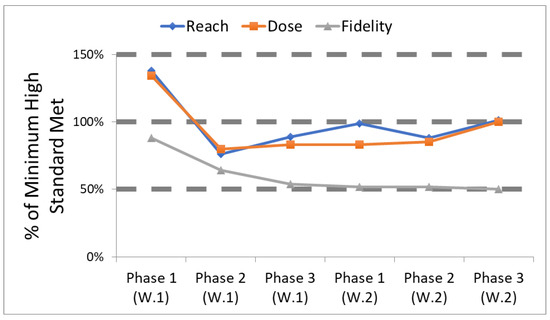 All three MLMC intervention trials conducted some form of process evaluation, with ongoing feedback. Perhaps the most formal version was employed by BHCK [18]. In BHCK, each intervention component had multiple measures for reach, dose delivered and fidelity [31,34,35,36,37]. Each of these measures had a minimum high standard for delivery, based on previous work, the literature, and/or specific resource constraints. Table 1 presents the standards set for delivery of the youth leader component of the BHCK intervention. For ease in communicating findings to our intervention team, we classified the degree to which each minimum high standard was met, where <50% of the high standard was viewed as low, 50%–99% was viewed as medium, and 100% of the standards set a priori was considered high. Every two months, roughly timed to coincide with the end of an intervention phase, the intervention team met and reviewed how well each standard was being met, and developed plans for improvement if reach, dose delivered and/or fidelity was below the minimum high standard (Figure 2). These regular meetings allowed the team to strengthen its efforts to improve specific aspects of the intervention, and over time led to enhanced program delivery [18].