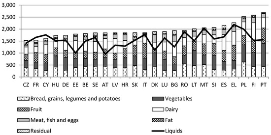 With regard to the amount of vegetables and fruits, country teams included on average between 300–400 g per day for each group. As explained above, the source of variation in the amounts relates to various factors, such as cultural differences (e.g., inclusion of vegetarian meals) or to differences in FBDG, e.g., some countries differentiate between fruit and vegetables while others formulate a joint recommendation. The amount of dairy products varies more across countries, ranging from 215 g in Latvia to 710 g in Finland. Also, for the group of meat, fish and eggs, variations fluctuate between less than 100 g per day (CZ, DE) to 339 g per day (LU). These variations reflect not only differences in guidelines but also, for instance, cultural differences in the composition of the meals. Countries with higher amounts usually include a portion of these foods in two of their meals per day, while others only include them for one daily meal. For the liquids group, the large variation is partly due to whether or not countries included wine and beer, and by the varying amounts of coffee and tea across countries. Water was the basic beverage in all countries and products like fruit juices or sodas were not included in this group, as they are not recommended on a regular basis. Milk was placed in the dairy group.