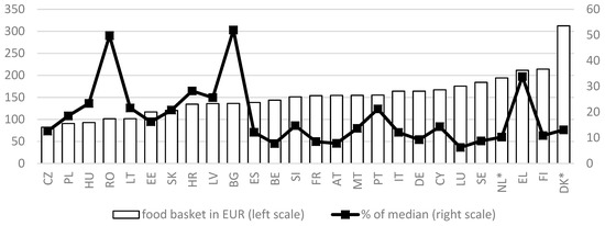 Total food baskets for a single woman in EUR / month (left axis) and as a percentage of the national median equivalent disposable household income (right axis). Results refer to the capital city of each country. Prices 2015. * Pricing procedure for DK and NL is not fully comparable. Source: [26] and Eurostat online database (median income).