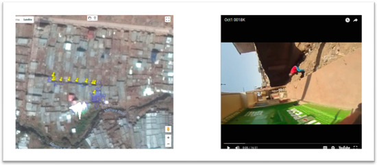 The user views the video and matches it with the extracted GPS path. When this GPS path wanders from where it should go (ascertained by comparing the video and overhead imagery), the user then manually corrects the coordinates. This is done by using easily discernible landmarks such as notable buildings, empty spaces, water bodies, vegetation, roads (and turns), bridges, and rivers/drainage canals. Pin markers are manually dropped onto the map when these features are seen on the YouTube video, with the software adding the associated media time stamp from the video as an attribute to the pin. This same approach can be used to backtrack from a GPS coordinate to “fill in” sections of the path where there had been no coordinates. For example, in Figure 1, the GPS path starts approximately 5 minutes after the beginning of the video. The software is used to create coordinates for the beginning five minutes by reversing the video and again using landmarks to guide pin placement. In this example, these features include the alley where the walk started, as well as open drains close to a bridge, vegetation especially single bushes, and proximity and orientation to some of the few high-rise buildings around Mathare.