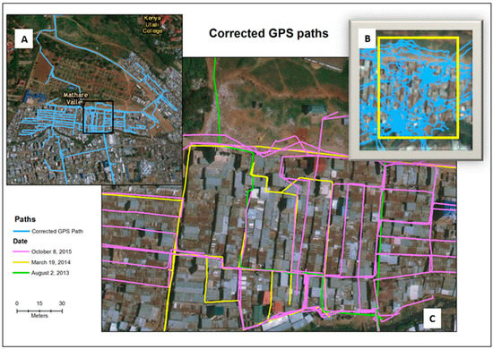 During the period August 2013 to October 2015, 26 handheld SVs were collected in the Mathare informal settlement of Kenya. All of these SV coordinate paths were improved using the GPS correction software. Figure 3 displays the corrected GPS paths for the entire study neighborhood (A), and a detail of three time periods (C) that coincides with the box on the inset map. The uncorrected paths (B) can also be compared with the same area. The SV within the residential area of Mathare was more easily corrected than the open areas where there were fewer visual cues. This graphic also shows various path intersections, which can be used for environmental change comparisons and GPS path validations.