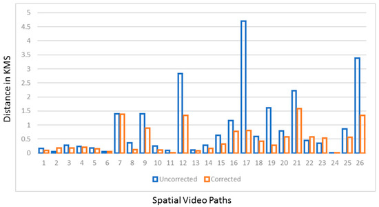 In previous research, GPS paths in an IS have been used to gain insights into different activities, such as water fetching. However, the physical distance as calculated by just using uncorrected GPS paths could lead to both over- (because the signal bounces so much) and underestimation (due to missing sections of coordinates). To determine the degree of this error, we calculated the differences in distance between each of the corrected and uncorrected paths. The amount of overestimation is considerable, with 85% of the corrected paths being less than 1 km long as compared to 69% of the uncorrected paths. Figure 4 shows this graphically for each path.