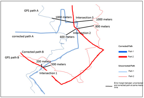 An alternative approach to visualize this error is to map the differences between the corrected and uncorrected paths at every coordinate. As the SV progresses, each frame has a corresponding coordinate and, therefore, we can measure the distance between the frame coordinate of the uncorrected and corrected paths. Figure 5 illustrates this conceptually showing two different time periods and for two corrected and uncorrected paths. Three intersection points were used to display the amount of error involved. For example, at intersection 1, there was a difference of 200 meters between the corrected and uncorrected paths of route A and 500 meters for route B.