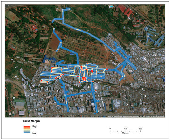 Informal settlements (IS) pose a considerable global challenge as they are the sites of multiple health, environmental, and social problems. At the same time, they are constantly changing and are data poor. To counter this spatial data deficiency, public health or epidemiological initiatives often rely on global positioning system (GPS) support. One example of a geospatial technology that has been used in challenging environments is spatial video (SV). SV combines imagery with locational information and can be used as a digitizing source for both cross-sectional and longitudinal research [1,2,3]. One problem influencing SV use is the GPS error caused by the typical type of IS built environment. These errors are especially problematic as SV requires spatial precision when mapping the video. If the coordinate connected to a video frame is wrong, so too will be the final digitized map.