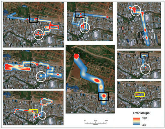 The error for each path was then visualized using a kernel density estimation (KDE), which is a common technique applied in epidemiological studies to show variations in spatial intensity. In this case the error for every corrected coordinate on all the SV routes was combined and used as input into the KDE. Figure 6 displays where the error was consistently higher across all SVG routes in Mathare for all time periods.