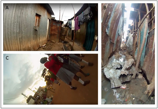 Mapping IS environments is critical for many reasons, for example addressing the area’s high disease burden [9,14]. Intervention teams require guidance as how best to target limited resources as these landscapes are far from homogenous with risks varying by season [15], time of day [16,17], and by micro-environments. For example, access to clean water, the availability of adequate sanitation, and appropriate personal hygiene (water and sanitation for health or WASH) [18,19,20] are constant challenges in an IS. WASH is also spatial, with the proximity to drainage or toilets and the intersection with elevation (acquired from DEM data) being useful to predict where disease is most likely to occur [7]. SV provides one solution for mapping IS environments [1,21,22] as the output allows the user to know exactly where each frame was captured. In this way, features such as drainage channels, latrines, standing water, mud, trash, animals, and human activity can be mapped, all of which can have implications in terms of local disease risk [23]. SV can also provide detail on the spaces between buildings, along the ground where children play, and the quality of the environment around each water point or toilet. A spatial video geonarrative (SVG), which adds an interview recorded at the same time as the SV, can further contextualize these spatial layers [24]. SVG can explain not only where health risks occur but also why they exist and persist. For example, if safety concerns affect utilization of WASH locations then SVG can help explain the location and usage of routes/water points/toilets and identify which are problematic. However, one challenge has doggedly hindered handheld SV collected in IS environments. These environments cause considerable GPS error and signal dropouts. Sometimes simplistic manipulations are applied such as substituting a straight-line (Euclidean) distance between features, which, if scaled accordingly, has been shown to be appropriate in more homogenous settings [25]. However, SV cannot use such a simple solution because the method relies on the linking of an image with an actual coordinate.