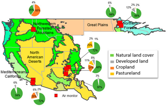 Air monitors located at school sites on tribal lands were situated in three distinct ecoregions: North American Deserts Ecoregion (represented by: arid areas lacking trees, comprised of unique shrub and cactus vegetation in an arid to semi-arid climate with seasonal temperature extremes; four monitors), Northern Forests Ecoregion (represented by extensive forests and lakes with numerous large drainage basin systems and a climate of long, cold winters and short, warm summers; three monitors), and Mediterranean California Ecoregion (represented by a mixture of lands including mountains, hills, and plains distinguished by a warm and mild Mediterranean climate; two monitors) [38] (Figure 1). Generally, these monitoring locations were in areas of low development (i.e., percent of developed land ranged from 2 to 12% by subwatershed). Except for one site for the Nez Perce reservation (ID) where percent of agricultural land was high (60% for cropland), the sites were in locations with heavy natural land cover (ranging from 60 to 97%). Natural land cover includes forest, grassland, barren land, shrubland, and wetland; across all sites, barren land was less than five percent of the natural land cover. Two school sites on the Navajo Nation reservation (NM) had very low diversity of land use types (0 to 20%) (a measure using job and housing unit counts by census block group), suggesting there was relatively little mix of land uses around these schools.