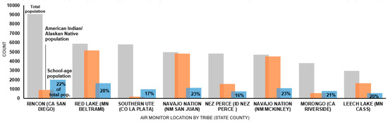 These schools were in census tracts with proportions of school-age populations (of the total population) ranging from 16% (Nez Perce ID) to 28% (Red Lake MN) (Figure 2). Sources of outdoor air emissions near these schools potentially impacted as many as seven schools located within a mile of air monitors in northwestern Minnesota (data not shown) and as many as 1648 school-aged children (28% of total population in census tract) being affected.