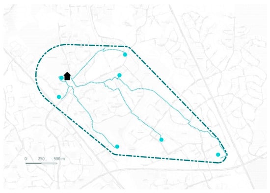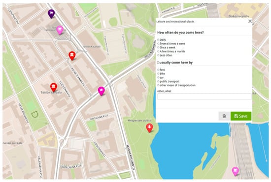Data were collected using an online participatory mapping method, PPGIS, which combines internet maps with traditional questionnaires []. PPGIS methods were developed for the purposes of both research and participatory planning practice to collect spatial experiential knowledge and to engage non-experts to identify the spatial dimensions of the environment []. In our study, respondents used an online interface to mark their (1) everyday errand points (EEPs) on a map (Figure 1). In addition, the respondents indicated which (2) transport mode they used and how (3) frequently they accessed the EEPs. The respondents were asked to mark on a map their (4) home and answer questions related to (5) their personal characteristics, such as their sociodemographic background and perceived health as well as (6) personal psychological features, namely respondents’ personal goals.
