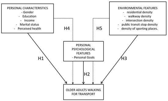 Previous studies have examined the associations between both the individual and the environmental factors and PA, or more specifically the active travel behavior of older adults, concluding that multiple levels of factors affect the PA behaviour [,,]. Following the principles of the ecological models of health behavior [] and the social ecological model of Little [] the conceptual framework for this study focuses on the impacts of the personal characteristics, environmental features and personal psychological features on AT of older adults (Figure 3). The framework illustrates the interactions among personal characteristics, different environmental features and personal goals on AT of older adults. The framework proposes that the personal characteristics, the environmental features as well as the psychological features, namely the personal goals, have direct effects, but that there are also indirect influences through personal psychological factors to the AT behavior of older adults. Thus, following the social ecological framework proposed by Little [] we hypothesize that personal goals serve as mediating conduit through which different personal and environmental features influence the walking behavior of older adults (H4 and H5). In addition, we tested the direct modelling hypothesis by evaluating the direct relationship between the personal characteristics (H1), psychological features (H2) and environmental features (H3) and walking.