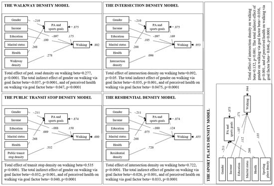 The studied psychological feature, the PA and sports goal factor, was found also having a direct effect on walking in each model, meaning that the higher score for PA and sports goals factor the person had the more they walked (Table 4). The environmental features, namely walkway density, intersection density, residential density, public transit stop density and the density of sporting places within the home range of each individual had all direct effect on walking and the direct effect of all the physical environmental features on walking was positive and quite large (Table 4 and Figure 4).