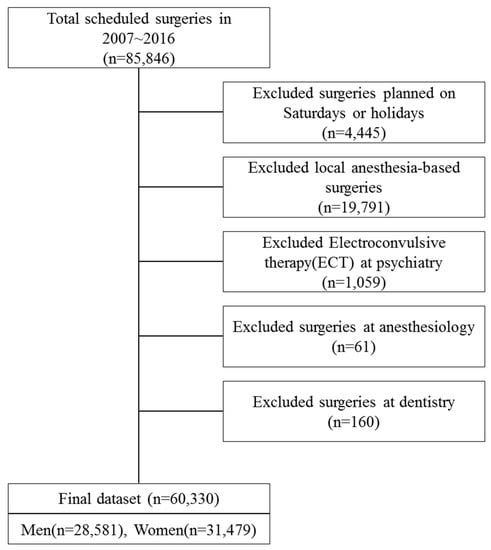Cho, H.S.; Lee, Y.S.; Lee, S.G.; Kim, J.M.; Kim, T.H. Reasons for Surgery Cancellation in a General Hospital: A 10-year Study. Int. J. Environ. Res. Public Health 2019, 16, 7. https://doi.org/10.3390/ijerph16010007