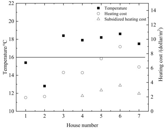 During the heating period, the annual heating costs and the indoor average temperature in different households are shown in Figure 1. The indoor temperature of the non-coal heating households is generally higher than that of the traditional coal-fired heating used by farmers. However, the annual heating costs of the non-coal heating households also are higher than that the coal-fired heating households. The government will subsidize 60% of the non-coal heating costs in China. The annual heating costs of the non-coal heating households will be greatly reduced, as shown in Figure 1. The indoor temperature of the No.3 household should ideally be higher than other coal-fired heating households, because there is a child in this household. So, the annual heating costs are higher than others.