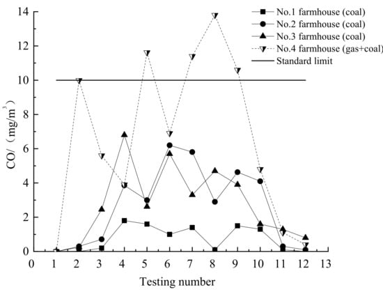 The indoor particles PM2.5 and PM10 are measured by CEL-712 Microdust Pro which made in England with the accuracy of 0.001 mg/m3. The national standards in China of PM2.5 and PM10 are 0.075 mg/m3 and 0.15 mg/m3, respectively. The results of the PM2.5 and PM10 are measured, as shown in Table 2. The indoor particles PM2.5 and PM10 exceed the national standards in China except No.5 and No.7. The reason is that the No.5 and No.7 households adopted non-coal heating in winter. The pollution emission was low through fossil fuel combustion. There were some plants in No.5 and No.7 and the plants can adsorb some particles []. So, there are few particles in the No.5 and No.7 households.