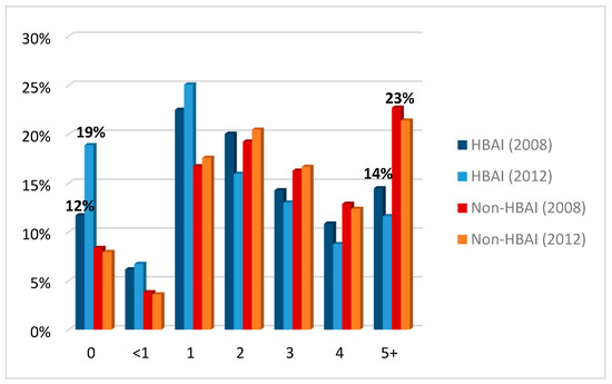 Figure 1 shows the percentage of SHeS individuals from HBAI and non-HBAI by number of portions of fruits and vegetables consumed on the day prior to the interview. In both years, there is a marked difference in the proportion of individuals reaching the 5-a-day target between those in HBAI and non-HBAI (14% and 32%, p < 0.001 in 2008 and 12% and 21%, p < 0.001 in 2012). Respondents in HBAI were more likely to report consuming no, or only one portion of, fruit or vegetables the previous day compared to their non-HBAI counterparts.