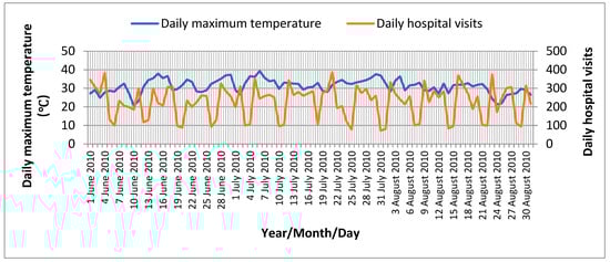 Daily maximum temperature and daily hospital visits in the study period of 2010 in Jinan.