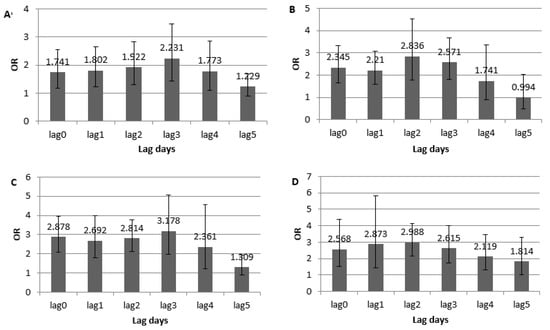 Figure 2 shows the estimated ORs of the four heat wave events on the effect of the daily hospital visits of mental illness from a 1-day to 5-day lag in the conditional logistic regression models. The results indicated that the heat waves significantly increased the daily hospital visits of mental illness in Jinan of 2010. The strongest effect was shown with a 3-day lag for the first heat wave event (OR = 2.231, 95% CI: 1.436–3.466), a 2-day lag for the second heat wave event (OR = 2.836, 95% CI: 1.776–4.525), a 3-day lag for the third heat wave event (OR = 3.178, 95% CI: 1.995–5.064), and a 2-day lag for the last heat wave event (OR = 2.988, 95% CI: 2.158–4.140), respectively.