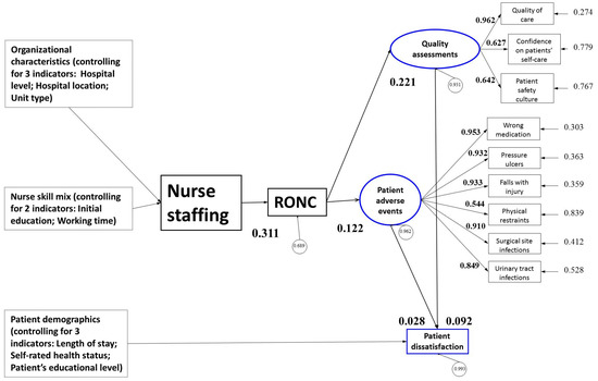 When controlling for all the confounding factors including organizational, nurse, and patient factors, RONC mediated the effects, which confirmed our second hypothesis. The mediation of RONC helps to explain how the structural component of nurse staffing affected patient outcomes. Studies, such as those recently adopted in England, also found that patients’ perceptions of care were significantly eroded by with increases in missed nursing care [30]. One of this paper’s tasks was to study patient outcomes—both considering nurses’ evaluation and patients’ perception. In the two latent models of “nurse-reposted quality assessments” and “patient adverse events”, factor loading estimates for all regression paths were > 0.40 (p < 0.01), meeting the traditional cutoff value [31]. In the latent model of “nurse-reported quality assessments”, the factor loading of the quality of care usually received by patients on their unit was the highest (0.962), indicating that this index was the main measurement index of nurse-reported quality assessments. In the measurement model of “patient negative event”, the factor loading of drug administration error was the highest (0.953), indicating that this index was the main measurement index of patient negative events.