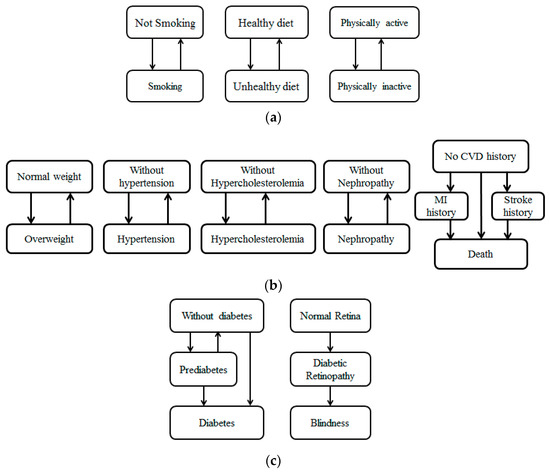 Individual health progression: (a) Health behavior state; (b) diabetic complication state; (c) diabetes-related health outcome state.