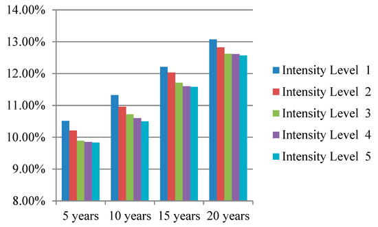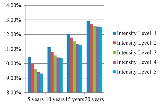 Although lifestyle interventions have turned out to be effective in preventing diabetes, they also bring economic costs. Incontrovertibly, an intensive intervention is more costly than a normal intervention. Therefore, we implemented a sensitivity analysis toward the intensity level and compared the preventive effect of lifestyle interventions with different intensities. Each kind of intervention had the same five intensity levels, reducing the proportion of people who smoke by 10%, 20%, 30%, 40%, 50%, separately.