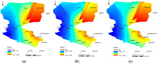As shown in Figure 4, compared with the reference period, the Tmean during the future period under RCP2.6, RCP4.5, and RCP8.5 all showed an increasing tendency, which was more significant as the concentration of RCP increased, i.e., RCP8.5 > RCP4.5 > RCP2.6. The Tmean increased more than 1 °C under both RCP4.5 and RCP 8.5 scenarios while, under the RCP2.6 scenario, the increase of the Tmean exhibited a relative lower value (<1 °C). From the regional perspective, the greatest temperature increase located in Ejin Banner, Jikede, Shandan, Yumen Town, and Qilian. Temperature increase was comparatively less in Gaotai, Yongchang, and Gangcha. The Tmean in the southern mountainous areas of the HRB was relatively low, while the temperature in the northern desert was comparatively high, with the Tmean increasing gradually from the southwest to the northeast. As shown in Table 1, compared with the reference period, the annual Tmean during the next 30 years increased by 0.84 °C, 1.14 °C, and 1.28 °C under the three scenarios, respectively, with the most significant temperature rise being in areas located in the lower reaches of the HRB, including Jikede, Ejin Banner, and Guaizihu.