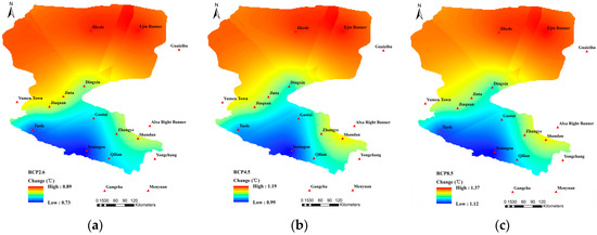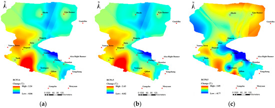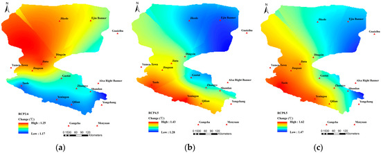 Spatial variation patterns of the Tmean under (a) RCP2.6; (b) RCP4.5; and (c) RCP8.5.