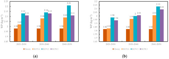 Decadal changes of the maize WP in the (a) Gaotai area and (b) Ganzhou area under the three RCP scenarios.