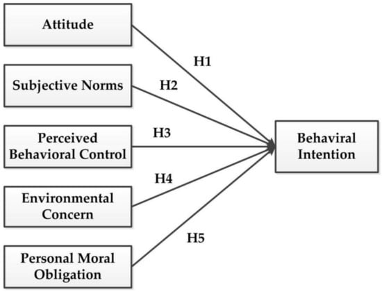 Although the efficacy and applicability of the TPB have been verified in previous studies, the TPB has been criticized for its lack of sufficient assumptions regarding individual intention and behavior. Therefore, other variables should be included to improve the interpreting ability of the TPB [,]. Ellen et al. [] and Zsoka [] proposed that individuals with a high degree of environmental concern have a strong willingness to protect the environment. Thus they expanded environmental concern based on basic TPB and confirmed the important influences of environmental concern on one person’s pro-environmental behavior. In addition, Gold [] and Kaiser [] purported that an individual’s willingness and behavior can be better predicted with a model that includes moral obligation, which should also be incorporated into TPB. Greaves et al. [] and De Leeuw et al. [] added descriptive norms into TPB to identify critical factors that influence the pro-environmental behavior of consumers. Zheng et al. [] and Shi et al. [] combined the technology acceptance model (TAM) with TPB to investigate the willingness of young people to rent a house and use urban-shared products, respectively. These additional variables expand and increase the efficiency of TPB in interpreting and predicting intention and behavior in specific situations.