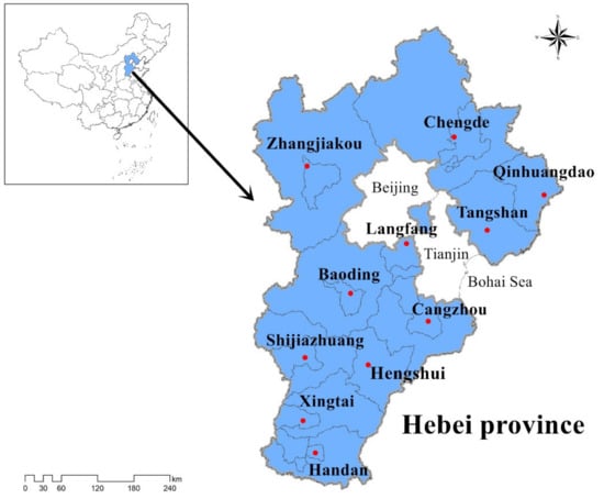 The questionnaire surveys were conducted in Hebei Province, China. As shown in Figure 2, Hebei Province is bordered by Bohai Sea in the east and Beijing (the capital of China) in the inner ring. Its geographic location is longitude 113°27′–119°50′ and latitude 36°05′–42°40′. Hebei Province covers an area of 188,800 km2 with a resident population of 75.56 million (ranked 6th out of 31) at the end of 2018 [].
