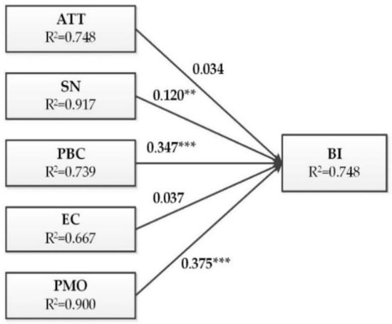 Figure 3 shows that the comprehensive effect R2 value of BI was 0.748, which means 74.8% of the variance in BI can be interpreted by the model. The R2 values of ATT, SN, PBC, EC and PMO reached 0.917, 0.739, 0.667, 0.900 and 0.748, respectively, thus accounting for 91.7%, 73.9%, 66.7%, 90.0% and 85.5% of the variance in the homologous constructs. As a result, each construct can be well explained by the proposed model.