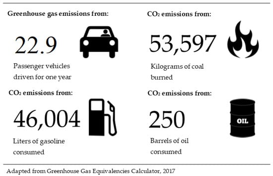 - Greenhouse Gas Equivalencies Calculator. Energy and the Environment. Environmental Protection Agency. Available online: https://www.epa.gov/energy/greenhouse-gas-equivalencies-calculator (accessed on 20 October 2017).
