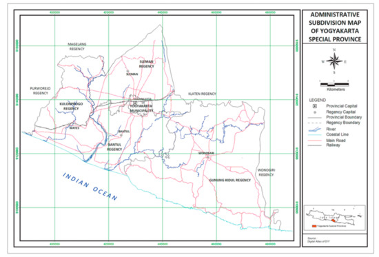 - Yogyakarta Office of Statistic. Daerah Istimewa Yogyakarta Dalam Angka; Badan Pusat Statistik: Yogyakarta, Indonesia, 2016; pp. 9–19, ISSN 0215–2185. [Google Scholar]