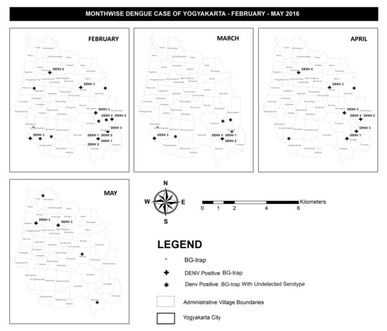 Figure 3 describes the spatial distribution of DENV infected Aedes aegypti in 19 BG-traps in Yogyakarta City during the study period. From December 2015 to January 2016 no DENV positive Aedes aegypti were detected. In February 2016, a total of one DENV positive Aedes aegypti was detected in Prenggan village. In March 2016, a total of 11 DENV positive Aedes aegypti were detected in the villages of Bumijo, Kotabaru, Ngampilan, Muja-muju, Tahunan, Gedongkiwo, Mantrijeron, and Prenggan. In April 2016, a total of three DENV positive Aedes aegypti in the villages of Warungboto, Giwangan, and Prenggan. In May 2016, a total of four DENV positive mosquitos in village of Kricak, Sosromenduran, Baciro, and Rejowinangun. Interestingly, in the same area of Prenggan village DENV-positive Aedes aegypti were trapped 3 months consecutively, February, March, and April (Figure 3).