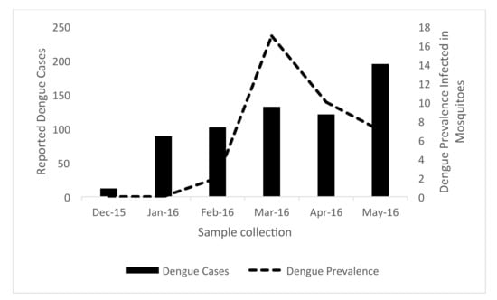 3.2. Monthwise DENV Prevalence in Trapped-Mosquito and Dengue Cases Reported in Human