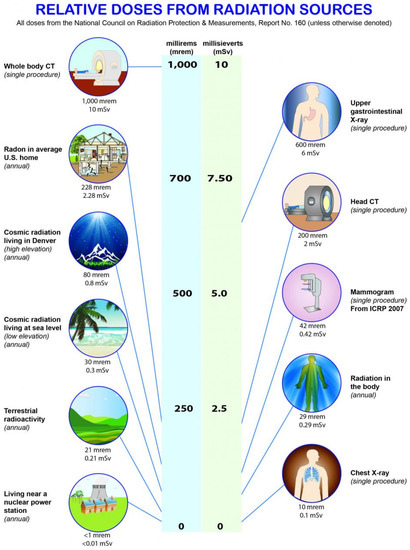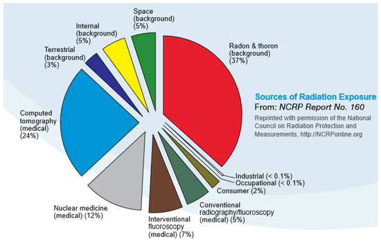 Human exposure to ionizing radiation is of interest to the population in general [1]. The U.S. Environmental Protection Agency (USEPA) estimates that the average human receives about 620 millirem of exposure to ionizing radiation per year [2]. The exposure profile occurs via three fundamental pathways, including natural influx from space (altitude dependent), local soils (radon and other radionuclides), and via health care procedures (e.g., CT scans, x-rays, therapeutic procedures). The relative degree of radiation exposure for an average person is shown in Figure 1.