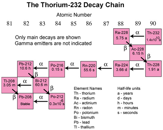 Approximately 99.3% of natural uranium occurs as the uranium-238 radionuclide, which has a half-life of about 4.5 billion years. The uranium-238 decay chain ends in the formation of the stable nuclide lead-206 (Figure 2) [18]. Daughter nuclides are radium-226 and radon-222 of which Radon-222 is the most common radon radionuclide. It forms by the alpha decay (emission of an alpha particle containing two neutrons and two protons) of radium-226. A primary health concern associated with uranium-238 and thorium-232 decay chains are the daughter products radon-222 and radon-220, respectively, because they can cause lung cancer upon sufficient exposure [19,20].
