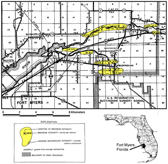 During World War II, the U.S. Army Air Force operated a gunnery school near Buckingham, Florida in Lee County. With the development of the first nuclear weapons, the U.S. Army performed some routine radioactivity background measurements near the Buckingham facility and found higher than background radiation activity values. In 1955, the U.S. Geological Survey in cooperation with the U.S. Atomic Energy Commission conducted an aerial radioactivity survey of parts of Lee, Charlotte, Hendry and Collier counties [46]. A series of “hot spot” areas were mapped in the northeastern part of Lee County (Figure 4). The background radioactivity was measured to be about 120 counts per second including the cosmic component. The discovered anomalies were above 170 counts per second and contained peak values of up to 330 counts per second. These anomalies were considered to represent deposits of radioactive material, but it could not be distinguished whether the radioactive source was uranium or thorium or some combination of both substances. During geologic mapping of Lee County conducted in the 1980s, it was found that these anomalies corresponded to the occurrence of the Buckingham Limestone Member of the Tamiami Formation and some of the Caloosahatchee Formation, which both contain reworked nodular phosphate [44,47,48].