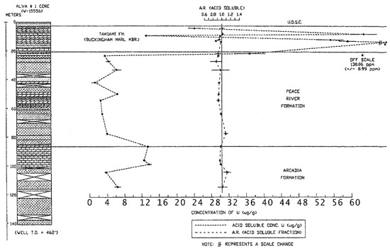 A direct association between gamma-ray activity measured in geophysical logs and the percentage of phosphate was found in all of the studied cores and there was a direct correlation with the occurrence of leachable uranium (Figure 5; [12]). However, Green [12] found that the gamma-ray activity in well logs was not dependent on the percentage of macroscopic phosphate nodules in the cores, but also on the clay-sized phosphate sediment and clays enriched in uranium. In addition, organic sediments also tended to be enriched in uranium and may also be present in the Buckingham Limestone member of the Tamiami Formation. This unit has measured concentrations of uranium ranging between about 15 to nearly 60 ppm (μg/g) (Figure 6; [12]). The total uranium concentration in the deeper geologic units, the Arcadia and Peace formations, ranged between 2 and 15 ppm. Anomalously high concentrations of uranium were found in the shallow sediments in the upper 50 m of the Alva core in Lee County, especially within the Buckingham Limestone Member of the Tamiami Formation which was also found in the aerial radioactivity survey [10,47]. Weinberg [10] measured uranium concentrations in phosphate nodules extracted from Buckingham Limestone at Alva to lie between about 440 and 729 ppm and concentrations in the bulk unsorted sediment were 45.4 ± 1.2 ppm at the top of the unit and 22.9 ± 0.4 ppm at the base of the unit [10]. In the Alva, Florida area, the high uranium concentrations in phosphate nodules also corresponded to high uranium and radium activities in groundwater [5,7]. Weinberg [10] suggested that the selective mobilization of the U(VI) fraction of the uranium present in the nodular phosphate in the Buckingham Limestone at Alva is the likely source of the uranium in the groundwater.