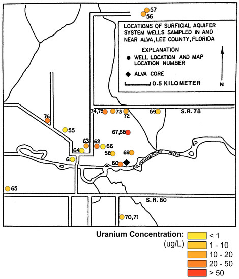 In a comprehensive study of the groundwater radioactivity in the Alva area, Levine [7] measured the concentration of uranium in 22 wells that tap the shallow, unconfined aquifer (Figure 7). He found that the highest measured concentrations were 278 and 460 μg/L in the same supply wells at Oak Park Mobile Home Village (Alva, Florida, FL, USA) in which Pellicer and O’Connell [5] found very high gross alpha activities. Extreme variability was found in the uranium concentrations, from 0.2 to 49 μg/L, in shallow wells within a 1 km radius surrounding the Oak Park supply wells (wells 67 and 69 in Figure 7). In addition, the activity ratio of 234U/238U was nearly 1.0 in the majority of the water samples tested. This is an important issue because of the much higher specific activity of 234U at 0.33 μCi/g compared to 238U at 6220 μCi/g. Levine [7] also found that the leachable uranium was as high as 72 μg/L in the sediment samples.