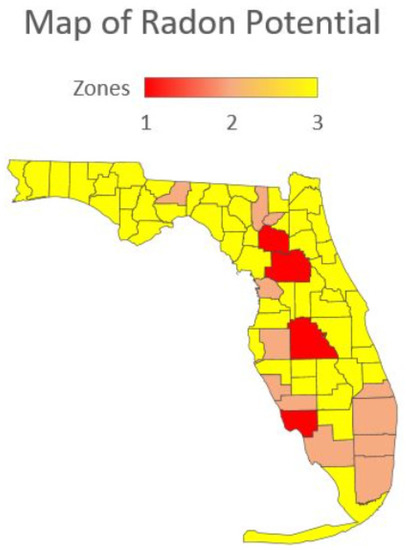 A statewide survey of radon activity risk was compiled as a map for Florida by USEPA from data acquired from a number of surveys (Figure 8; [50,51]). Only 9 of 67 counties in Florida showed a moderate risk for radon health risk. The yellow color denotes low risk, orange shows moderate risk, and red indicates high risk. In southern Florida, only Dade County was classified as a moderate risk with all other counties being classified as low risk. Given the results summarized in Table 8, it is interesting to note that Lee, Collier, Charlotte, and Sarasota counties were not among the moderate risk counties. It is likely that the radon survey data for Lee County may reflect in part the Alva, Florida data associated with the “hot spot” of radiation as previously described.