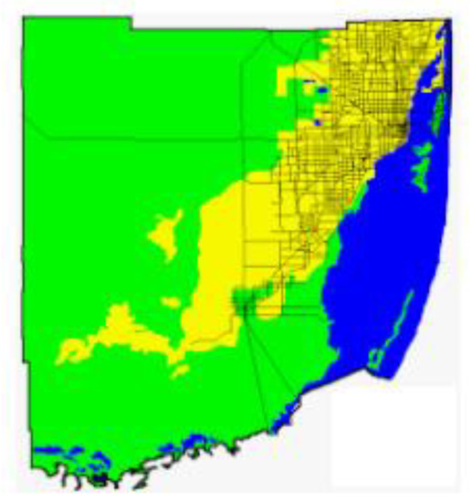Because of the elevated radon activities in Miami-Dade County, the Florida Department of Health produced a map of Miami-Dade County showing areas where passive controls for indoor radon are recommended [53]. The recommended passive controls area is yellow on the map (Figure 10) and corresponds primarily to the occurrence of the “ridge area of the Miami Limestone” (oolite facies).