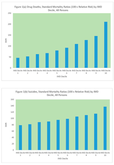 Many studies report that socio-economic deprivation and poverty are associated with higher drug misuse, drug-related mortality and increased suicide risks [27,28]. The impact of area deprivation is partly because it is an aggregate of individual risk factors for drug misuse and suicide, such as lower education [29], unemployment [30] and low income [31]. That is, area deprivation is partly a compositional measure of risk. However, it may also partly reflect contextual risks, or place effects per se. This shows in studies of mental illness, which, controlling for individual characteristics, show significant effects of area socioeconomic disadvantage [32,33]. The analysis below uses the UK government’s Index of Multiple Deprivation (or IMD) as a score measure for area socio-economic status.