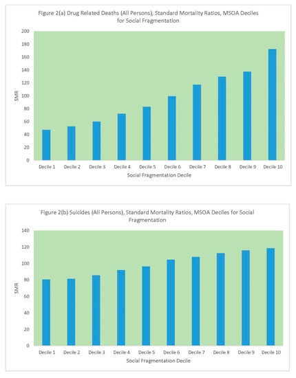 Many studies have confirmed impacts on drug misuse and suicide of neighbourhood social cohesion, which is here represented inversely by an index of social fragmentation. Low cohesion (high fragmentation) is generally proxied by available indicators such as high residential turnover [24,31], high numbers of non-family households and one person households, above average numbers of non-married adults [27,34], and absence of community institutions promoting cohesion. Impacts of neighbourhood fragmentation/cohesion on the two outcomes are to some extent simply compositional; for example, living alone and being unmarried are risk factors for both suicide [35] and drug-related death [36]. Housing type and tenure mix may also be relevant: in the UK, private sector rented housing is a comparatively insecure, short-stay form of housing, with Swales and Tipping [37] reporting that privately renting tenants are less likely to feel they belong to their neighbourhood or trust neighbours. The social fragmentation score used here is obtained from principal component analysis of the four variables of Congdon [34] using 2011 Census data, which measure one person and non-married households, population turnover and private sector renting.