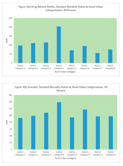 There are variations between countries in how far drug mortality and suicide are related to urbanity, or its converse rurality, and account may need to be taken of confounding influences (including access to means) and gender differences. In the US, Ho [38] noted a convergence in drug-related deaths between rural and urban areas, whereas a rural excess remains for suicide [4]. Regarding the UK, Gartner et al. [39] reported male suicide mortality to be 11 per cent higher in rural areas after adjustment for socio-economic deprivation in 2002–2004, and more contemporary evidence shows a continuing rural excess [40].