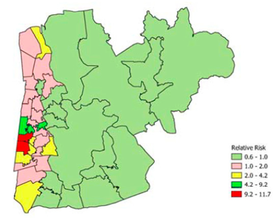 Thus, Table 7 shows the 20 MSOAs with the highest predicted relative risk of drug-related death (all persons). It can be seen that five of the 20 are from one local authority, namely Blackpool. Map representation of Blackpool and two adjacent local authorities shows the clustering of extremely elevated DRD risk (Figure 4), with relative risks exceeding 10 in two MSOAs. The latter MSOAs are adjacent coastal MSOAs in Blackpool. The excess risk in these MSOAs contrasts with a background of lower than average risk in eastern MSOAs in the region mapped.