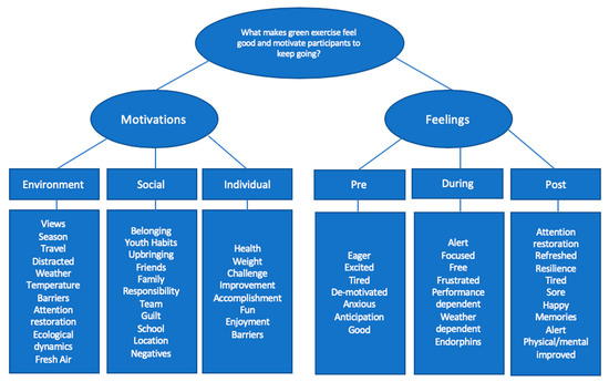 Previous research has examined motivations to conduct green exercise through quantitative measures. However, previous green exercise studies have underutilised mixed research methods to understand why participants seek out such environments. Furthermore, few studies have qualitatively compared differences between a range of green exercise participants. Anecdotal responses with regards to how participants felt increased mood and affect following and during a session of green exercise may be easier to interpret for the general public and may prove useful in further promotion of green exercise. The qualitative phase of the study identified two main themes from the interviews. Motivation and feelings were identified as primary themes in what drives these participants to continue to conduct and adhere to green exercise. Within these two themes, several sub-themes were developed which intermixed to tell the story of each theme. With regards to the theme ‘motivation’ there were a number of similarities in what drove participants from the different forms of green exercise to begin and continue to conduct their outdoor activity. The theme of motivation was broken down into three sub-themes: Environment, social, and individual. The participant responses revealed that these sub-themes interact to motivate participants to continue to maintain conducting green exercise. Accounts from the participants highlighted that the natural environment was an important setting, which when combined with physical activity, resulted in participants expressing increased motivation to conduct exercise.