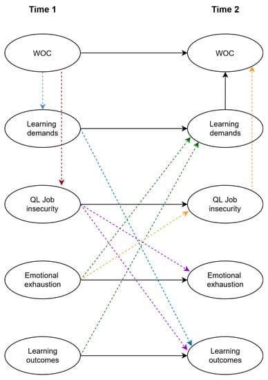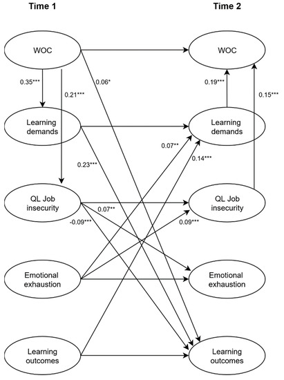 Moreover, in this study, we conducted a cross-lagged testing of the relationships in our model, which delivered several additional findings. As the reciprocal model showed the best fit for the data, some reversed effects were also observed. Learning outcomes were positively associated with the perception of learning demands over time, corroborating the idea that learning demands can be viewed as challenging. Exhaustion was positively associated with both learning demands and qualitative job insecurity over time. This finding is in line with previous research which also found reversed effects of health and well-being on job demands [